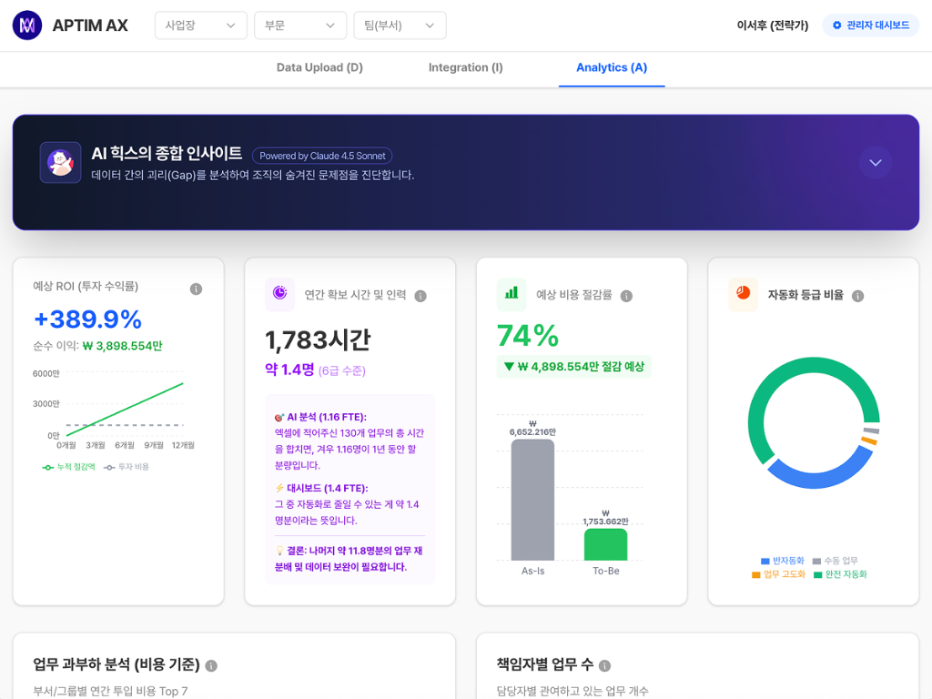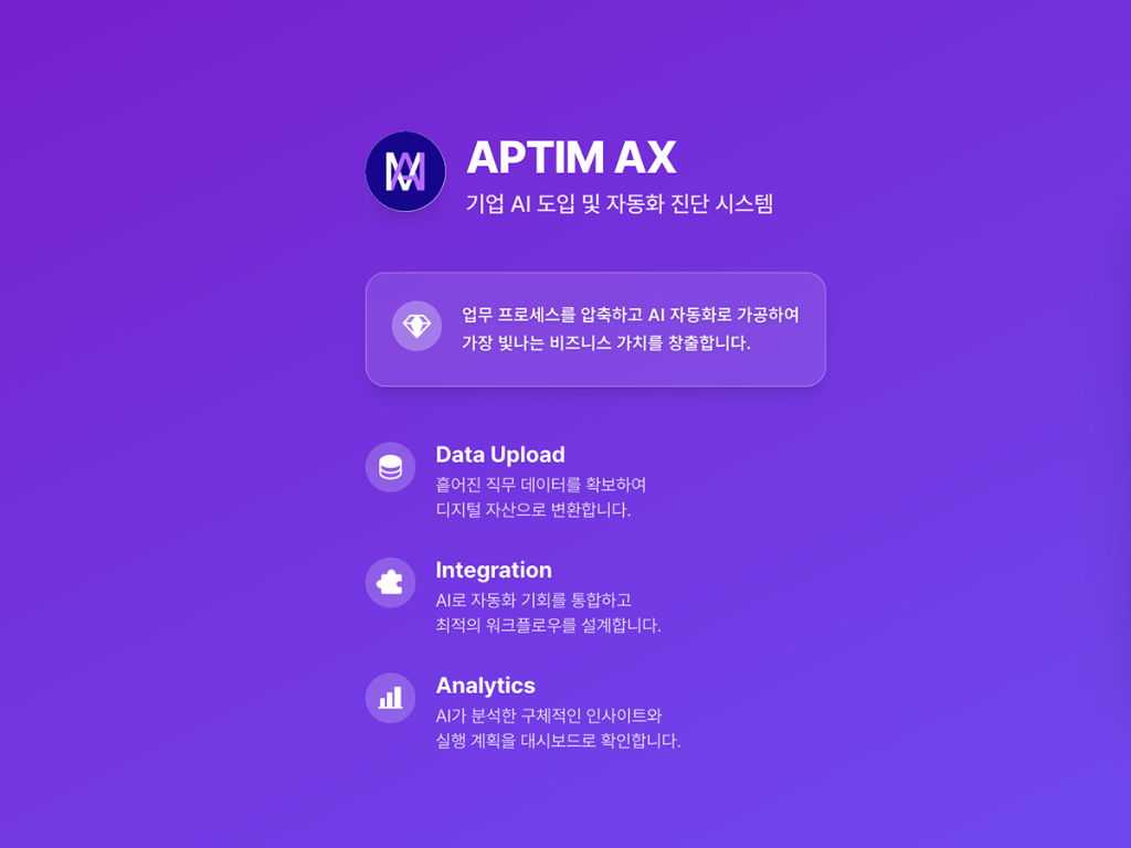 기업 AX를 위한 직무 분석 및 진단 플랫폼. AI 로직을 통한 비정형 데이터 자산화, 업무 프로세스 시각화, 협업 구조 및 자동화 가능성 진단을 제공합니다.