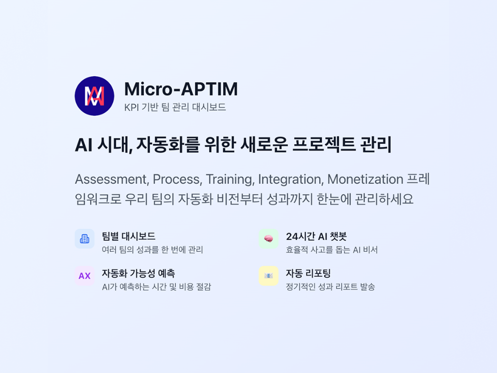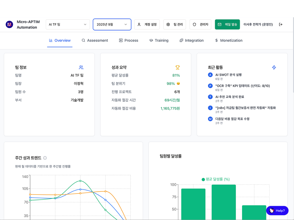 B2B SaaS 팀 성과 관리 시스템. APTIM 프레임워크의 팀 단위 축소판으로서, 팀원 업무 현황 및 성과 투명화로 효율성을 극대화합니다.