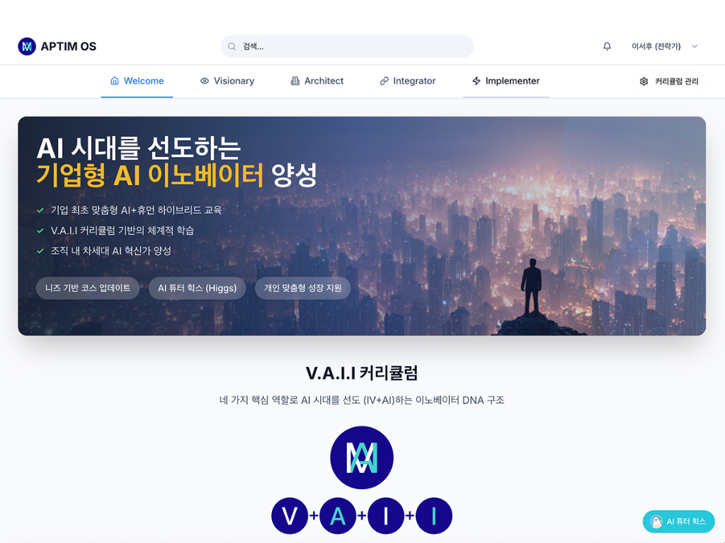 VAII 커리큘럼 기반 휴먼+AI 튜터 하이브리드 온/오프라인 코칭 플랫폼. 역할 기반 학습 경험과 AI 힉스와의 맞춤형 토론을 제공합니다.
